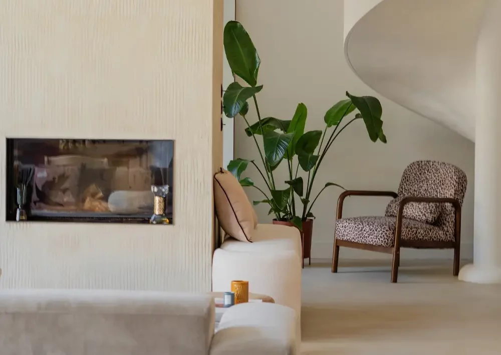 Au centre de la maison, une large cheminée travaillée à la chaux marque la séparation entre l’entrée et le salon, tout en instaurant une atmosphère accueillante. Le choix des teintes douces et naturelles renforce cette harmonie apaisante, où chaque détail semble pensé pour dialoguer avec l’histoire du lieu. À l’étage, les espaces nuit sont organisés avec soin, offrant confort et intimité à toute la famille.